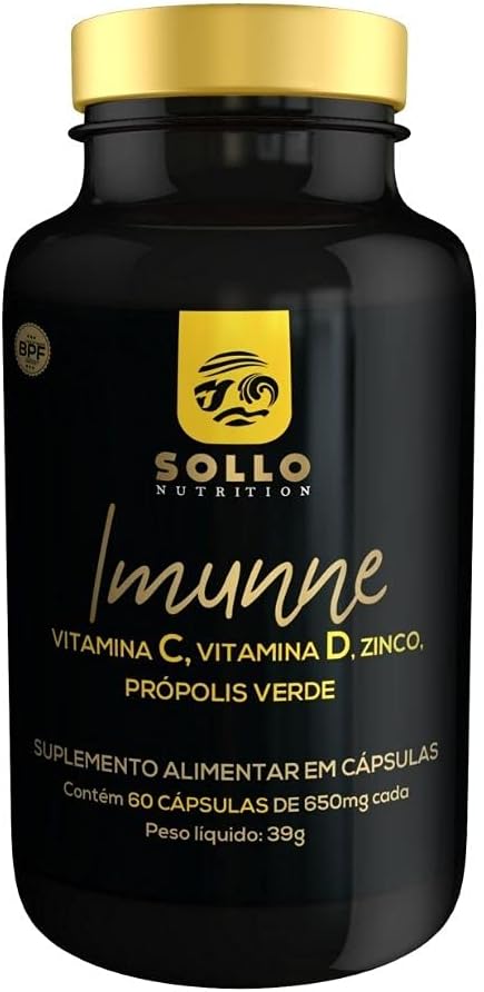 O composto de Imunidade Imunne da Sollo Nutrition é composto de Extrato de Própolis Verde, Vitamina C, Vitamina D e Zinco.